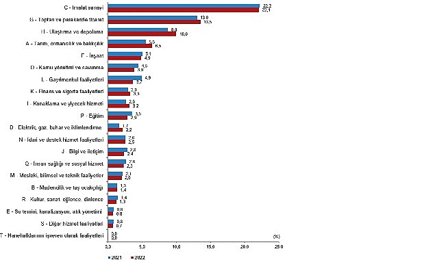 I-Konaklama ve yiyecek hizmeti faaliyetleri %32,1, K-Finans ve sigorta faaliyetleri %20,7 ve T-Hanehalklarının işverenler olarak faaliyetleri %20,6 ile 2022 yılında en çok büyüyen sektörler oldu. D-Elektrik, gaz, buhar ve iklimlendirme üretimi ve dağıtımı %24,6, F-İnşaat %7,1, B-Madencilik ve taş ocakçılığı %5,5 ile en çok küçülen sektörler oldu.