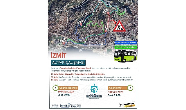 Kocaeli Büyükşehir Belediyesi, İzmit Cedit Mahallesi Topçular Sokak’ta altyapı çalışması başlatıyor. Çalışma kapsamında bu yolu kullanan 51 ve 53 no’lu hatlarda güzergah değişikliği yapılacak.OTOBÜSLERDE GÜZERGAH DEĞİŞİKLİĞİKocaeli Büyükşehir Belediyesi, İzmit Cedit Mahallesi Topçular Sokak’ta altyapı çalışması gerçekleştirecek. 10 Mayıs Cumartesi günü (yarın) saat 09.00’da başlayacak altyapı çalışması kapsamında Ulaşım Dairesi Başkanlığı 51 ve 53 no’lu hatlarda güzergah değişikliği kararı aldı. 53 no’lu Batı Terminali-Topçular-Umuttepe hattı, Topçular Şeref Meydanı’ndan başlayarak Umuttepe güzergahında hizmet verecek. Bu hattı kullanacak olan yolcular 51 no’lu hattı kullanarak Topçular Şeref Meydanı-Erenler Cedit-Akçakoca Konutları’ndan ücretsiz olarak aktarma yapabilecek. Çalışma dolayısıyla 51 no’lu hattın güzergahı da değiştirilerek Rasathane, Bağçeşme ve Topçular Şeref Meydanı olarak güncellendi. Kaynak: (BYZHA) Beyaz Haber Ajansı