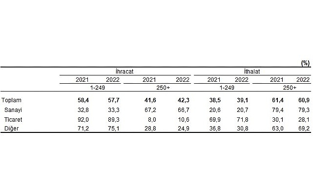 Sanayi sektörü ithalatında büyük ölçekli girişimler %79,3 pay ile öne çıktı. Ticaret sektöründe, büyük ölçekli girişimlerin payı %30,1'den %28,1'e düşerken, diğer sektöründe büyük ölçekli girişimler %69,2 pay ile önde olmaya devam etti.