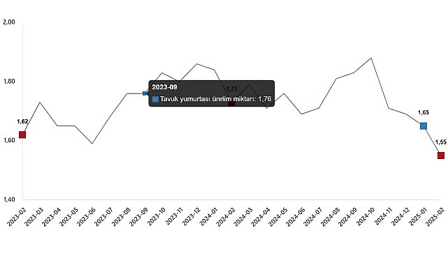 Bir önceki ay 1 milyar 652 milyon 615 bin adet olan tavuk yumurtası üretimi Şubat ayında %6,4 oranında azalarak 1 milyar 547 milyon 93 bin adet oldu.Tavuk yumurtası üretim miktarı, Şubat 2025