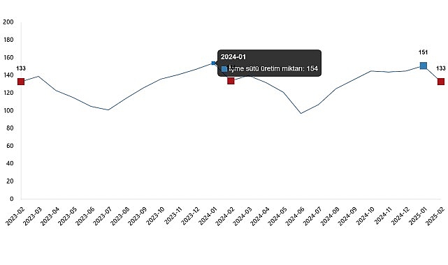 Bir önceki ay 150 bin 681 ton olan içme sütü üretimi Şubat ayında %11,9 oranında azalarak 132 bin 720 ton olarak gerçekleşti.İçme sütü üretim miktarı, Şubat 2025
