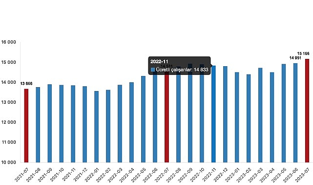 Ücretli çalışanların alt detaylarına bakıldığında; 2023 Temmuz ayında ücretli çalışan sayısı yıllık olarak sanayi sektöründe %1,3 arttı, inşaat sektöründe %14,7 arttı ve ticaret-hizmet sektöründe %4,4 arttı.